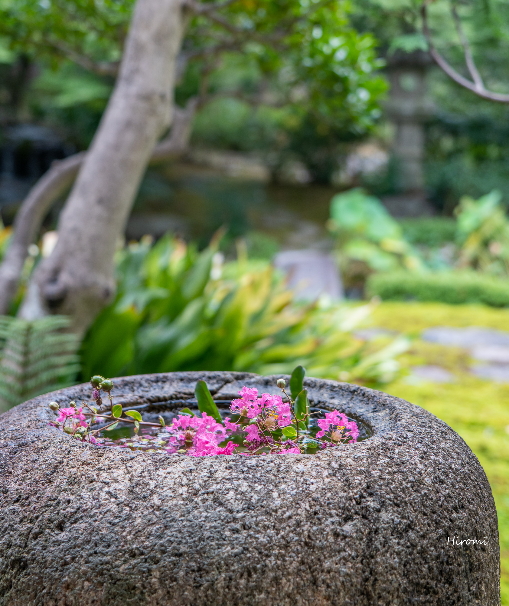 お庭が濃いピンクに覆われるくらい咲いていて、池のリフレクション「水鏡」もみどころです。