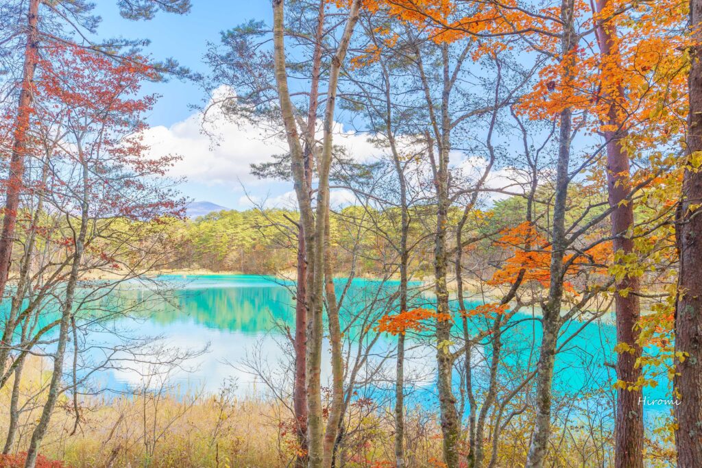 磐梯山と秋には真っ赤な紅葉と、エメラルドグリーンの沼とのコラボが絶景です。